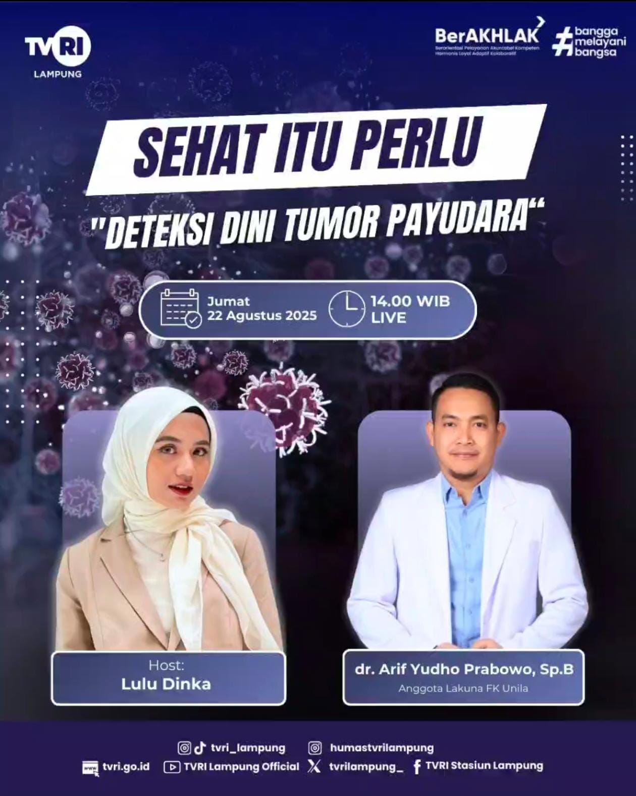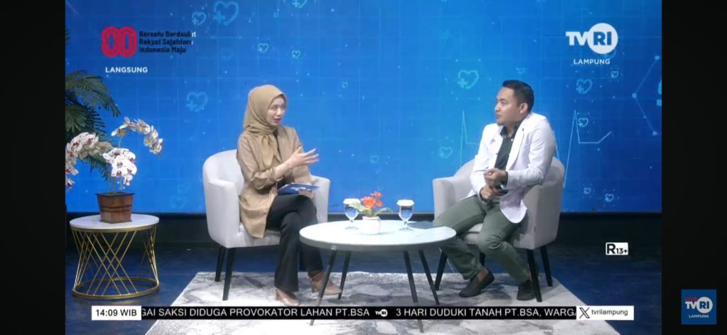 dr. Arif Yudho Prabowo, Sp.B, alumni FK Unila angkatan 2009, hadir sebagai narasumber dalam program talkshow kesehatan “Sehat Itu Perlu” yang ditayangkan secara langsung di TVRI Lampung pada Jumat, 22 Agustus 2025.