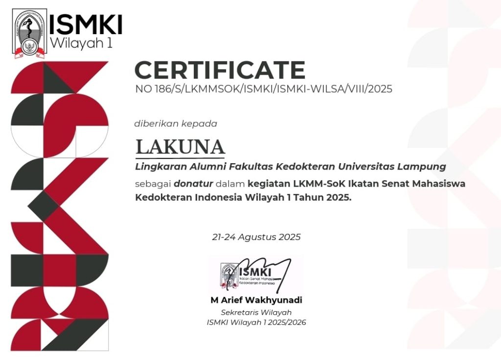 Lingkaran Alumni Fakultas Kedokteran Universitas Lampung (LAKUNA) turut berpartisipasi dalam kegiatan Latihan Kepemimpinan Manajemen Mahasiswa – School of Kastrad (LKMM-SoK) Wilayah 1 yang diselenggarakan oleh Badan Eksekutif Mahasiswa Fakultas Kedokteran Universitas Lampung bekerja sama dengan Ikatan Senat Mahasiswa Kedokteran Indonesia (ISMKI).