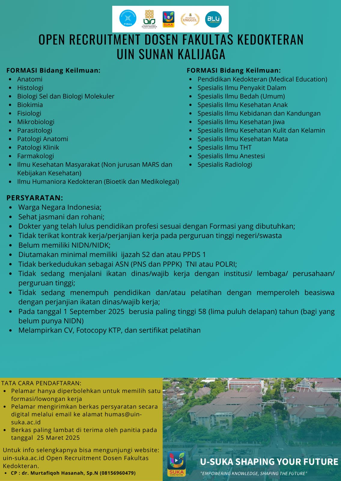 Fakultas Kedokteran UIN Sunan Kalijaga membuka kesempatan bagi para profesional di bidang kedokteran untuk bergabung sebagai dosen.